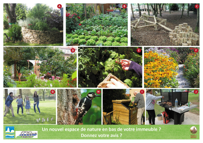 A partir de cette planche de photos, nous présentons le projet proposé par la collectivité. Nous demandons aux habitants de choisir 3 photos de ce qu’ils aimeraient voir ou faire dans le jardin.